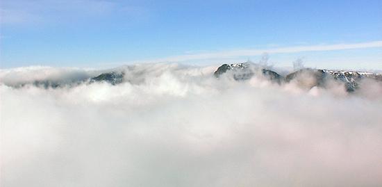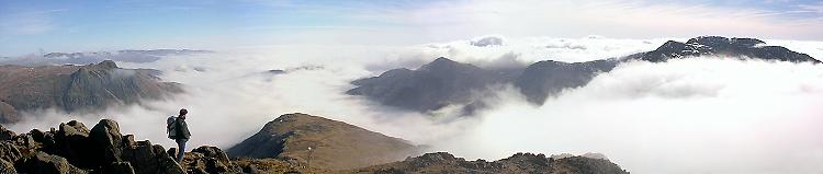18 Feb 2001 Bowfell, via The Band (the east ridge). Thick fog blanketed most of north west England this morning, but we soon got above it into the sunshine. On the western side of the mountains the fog had lifted to low cloud, which was spilling over the ridges leaving the summits clear. This cloud was steadily creeping further east and rising, and we only just got to the summit in time to snatch a few photos - fifteen minutes later we were enveloped in the cloud.