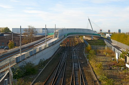 The 'finback' bridge which takes the Metrolink Oldham line over the existing heavy rail line.