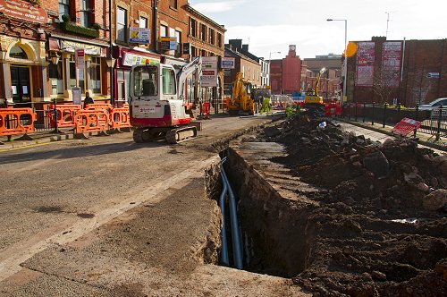 Oldham. Utility diversion work prior to laying the Metrolink tracks through the town centre.