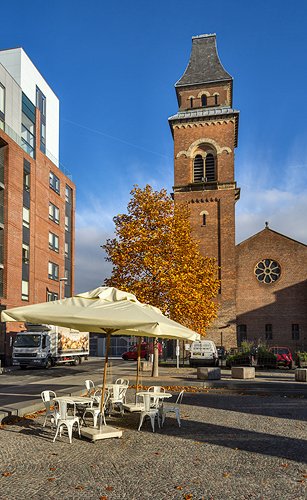 Cutting Room Square and the former St. Peter's church,now a rehearsal centre for the Hallé orchestra.