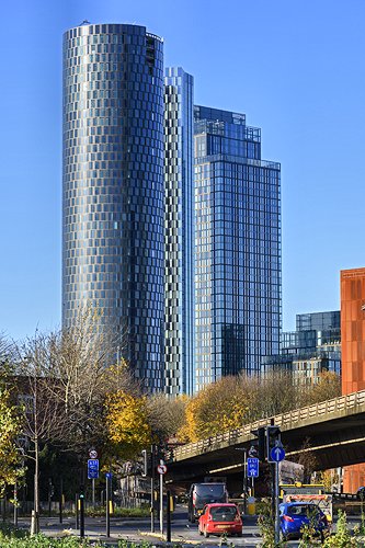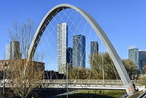 The Deansgate Square apartment blocks seen through the Hulme Arch bridge.