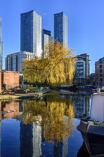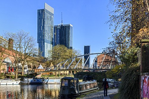 The Deansgate Square apartment blocks from Castlefield Basin.