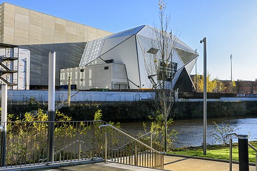 The Aviva Studios arts centre (Factory International) over the river Irwell.