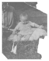 | The original print, dated c1889, measured about 3x2 inches, was low in contrast and had been physically damaged, as shown on the smaller image above. In order to restore it I first re-photographed the print and enlarged it onto a 10x8 sheet (I didn't have a scanner at the time and didn't want to send the original away to be scanned). Once I had the image in the computer I increased the contrast and sharpened it slightly before restoring the missing areas using the 'Clone' tool. This part was relatively easy as, fortunately, the missing areas were either grass or very dark. I then removed the scratches and dust marks using the 'Single Pixel' or 'Clone' tools, while viewing at high magnification. Finally, more adjustment of contrast and brightness, then another cycle of 'Sharpen'. Any more attempts to sharpen it resulted in a very grainy picture. The final image was sent away to be transferred to 35mm film as a negative, from which normal photographic enlargements were made. | |