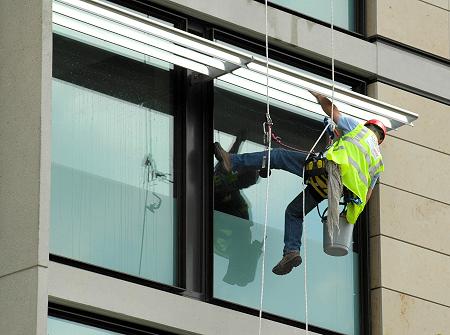 Window cleaner at the new hotel on the site of the old Free Trade Hall