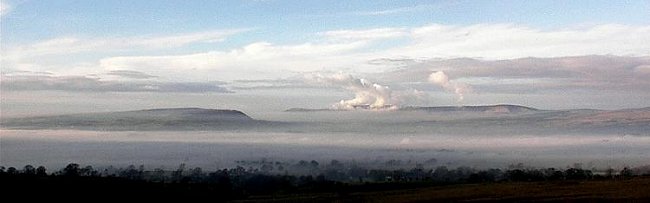 The lonely moorlands of the Forest of Bowland over a mist filled Hodder valley.