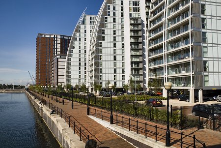 Airport and Salford Quays. Bright sun.