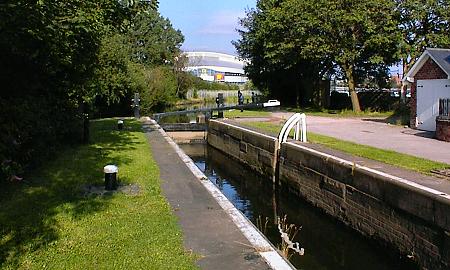 The National Squash Centre from the Ashton Canal. The stadium behind.