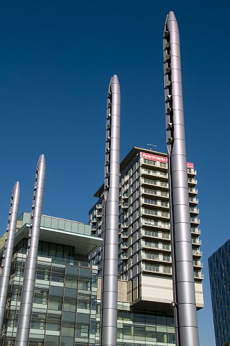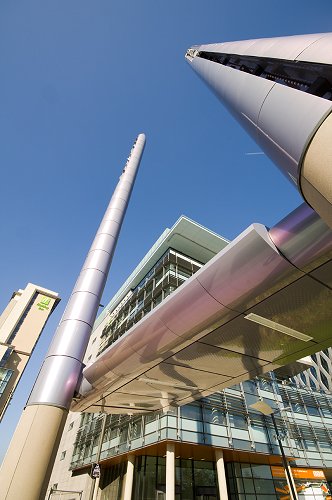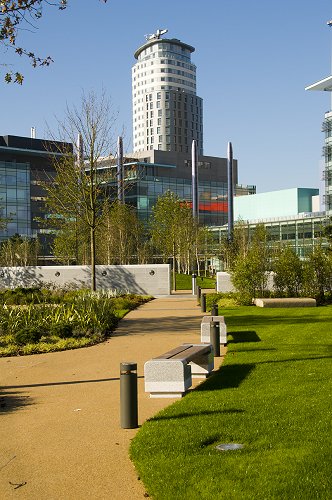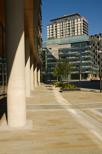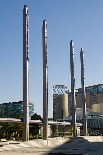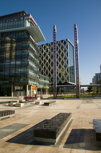 Lighting columns on the piazza. The Lowry Centre behind.