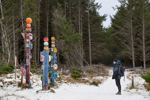 Totem poles, made by local school children from recycled materials -