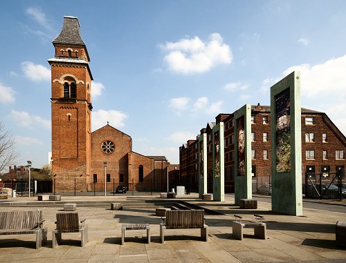 Cutting Room Square, Ancoats. Around the square are five 'sentinels', inset with artworks by Ancoats