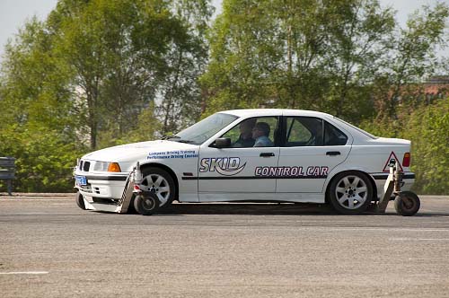 Skid control training car. The small wheels on the outriggers can be raised or lowered independently