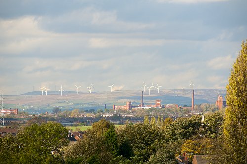 Zooming over Chadderton to the Scout Moor wind farm, Rossendale.