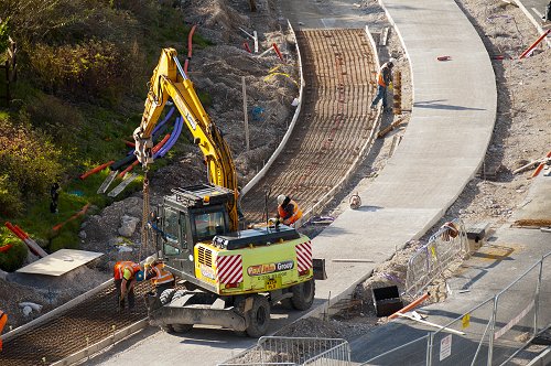 The future Ashton tram terminus. The base for the platforms is in position.