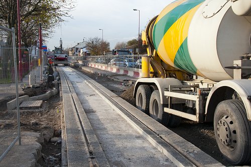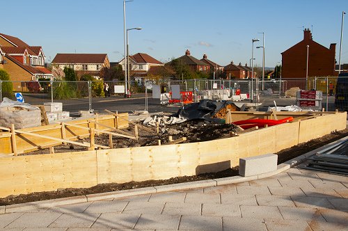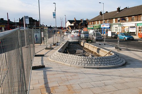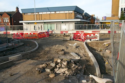 Further east, on Manchester Road, kerb-stones being concreted into place.