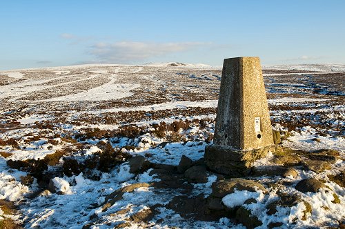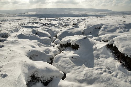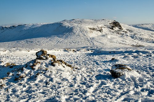 Kinder Scout and Mill Hill from Bleaklow. The snowman looks like he's had a rough night.