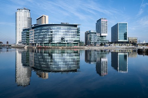 The MediaCityUK complex over the Manchester Ship Canal.