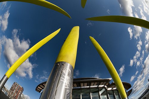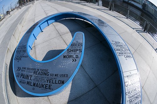 The Number 9 Dock sculpture and the Lowry Arts Centre. Fisheye lens.