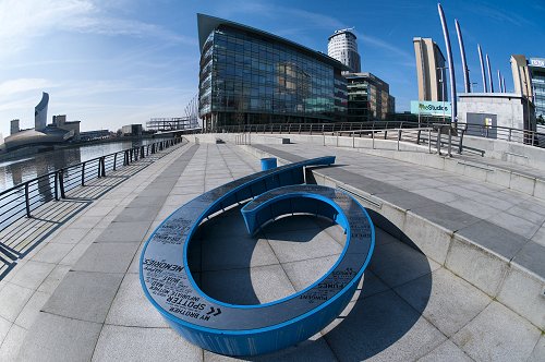 The Number 9 Dock sculpture and the BBCs Quay House. Fisheye lens.