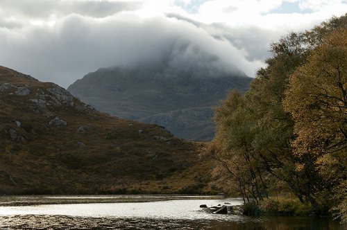 Foinaven (in the cloud) and the ridge of Beinn Spionnaidh.