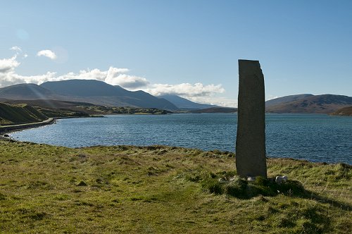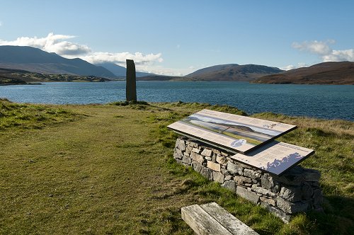Standing stone (modern) and information boards at Keoldale on the Kyle of Durness.
