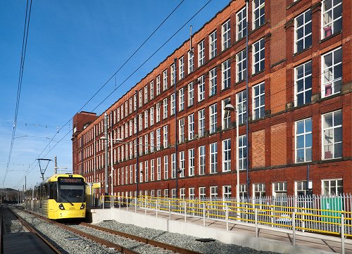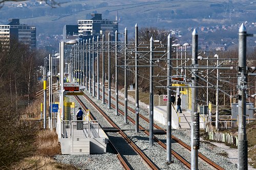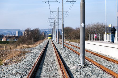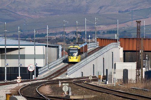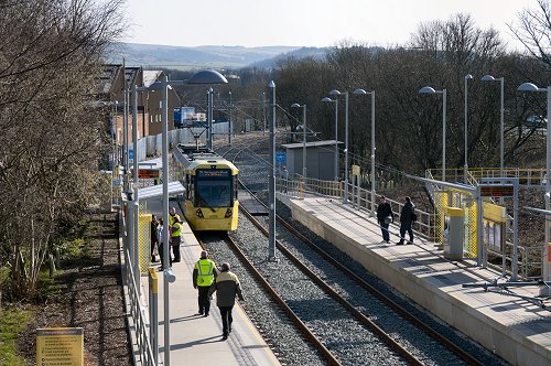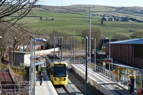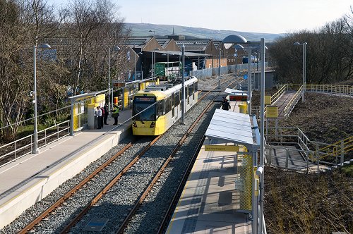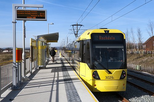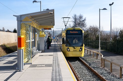 Kingsway Business Park stop with the towers of Rochdale in the distance.
