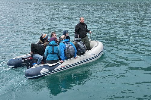 The boats can't moor at the jetty so we are ferried across in an inflatable.