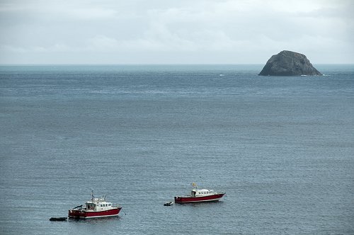 The 'Hirta' and the 'Orca III' in Village Bay, with Levenish behind.