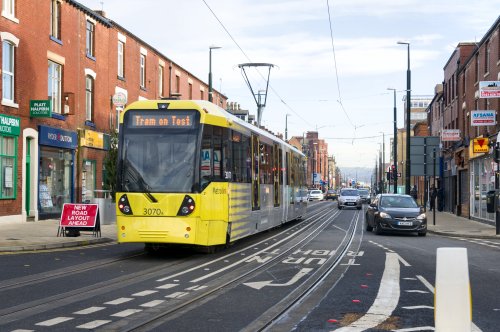Oldham town centre Metrolink extension. Hazy sun.