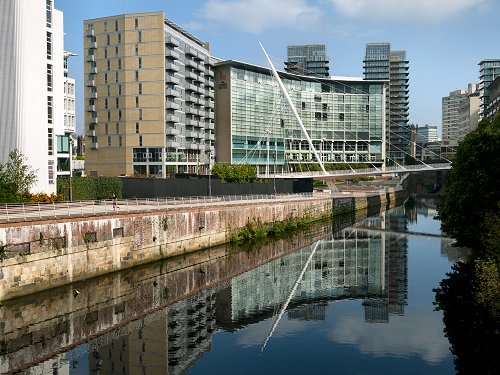 Trinity Bridge (Santiago Calatrava 1996), with the Lowry Hotel behind.