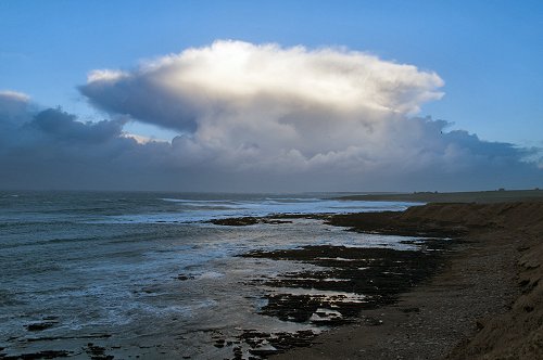 A brief glimpse of the sun. Dunnet Head is just visible in the distant gloom.