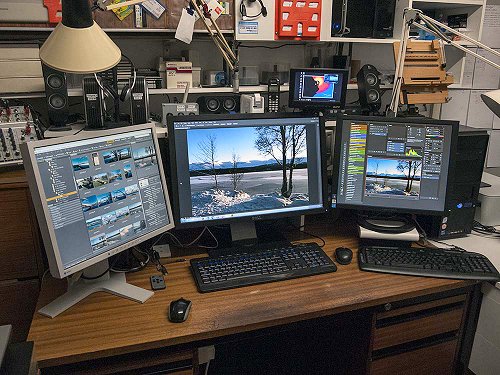 New computer outputs to three monitors with the main Photoshop screen uncluttered on my main monitor
