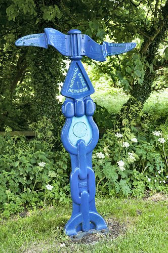 Sustrans sign. The coastal path crosses a disused railway line here,