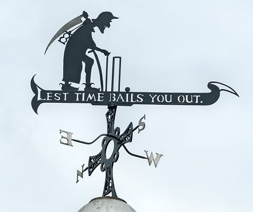 The Grim Reaper, with cricketing pun, on the top of the bandstand.