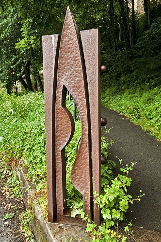 Carved wooden seat on the riverside path near Prebends' Bridge