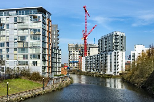 Apartment blocks, built and under construction, by the River Irwell, Salford.