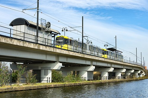 Metrolink tram on the viaduct alongside the Bridgewater Canal.