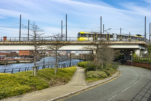 Metrolink tram crossing the river Irwell-Manchester Ship Canal at Pomona Strand.