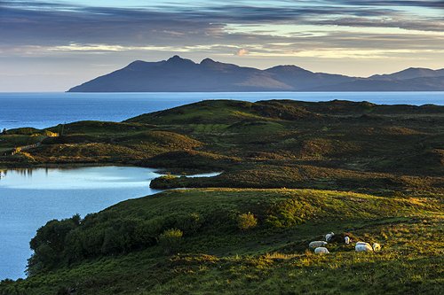 Loch Gauscavaig with the islands of Eigg and Rum in the distance.