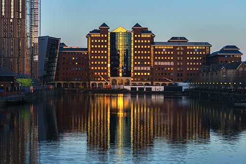 Light from the setting sun illuminating the widows of The Studio, MediaCityUK
