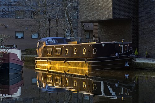 The former lock keeper's cottage and a narrowboat on the Ashton Canal.