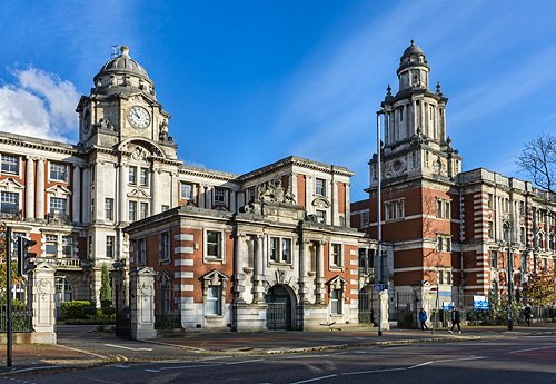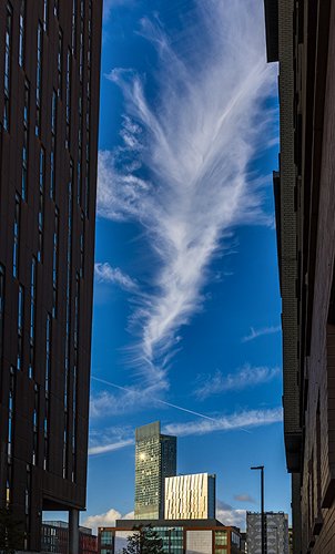 Iridescent cloud above a tower of the Manchester Royal Infirmary building.