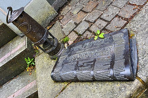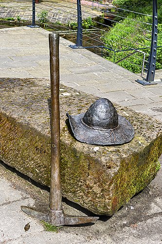 Sculpture depicting a miner's lamp and a newspaper front page.